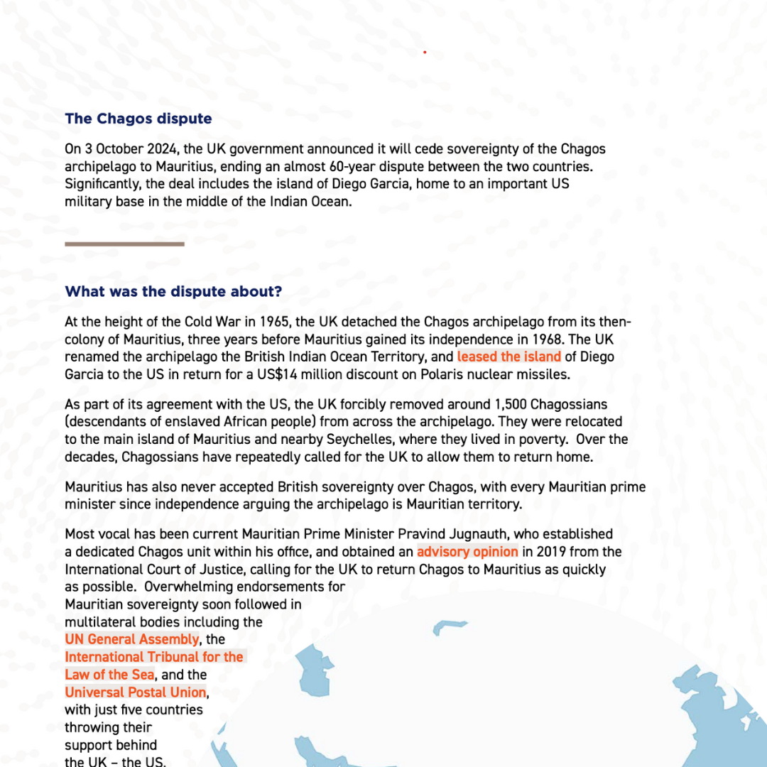 On 3 October 2024, the UK government announced it will cede sovereignty of the Chagos archipelago to Mauritius, ending an almost 60-year dispute between the two countries. Significantly, the deal includes the island of Diego Garcia, home to an important US military base in the middle of the Indian Ocean.