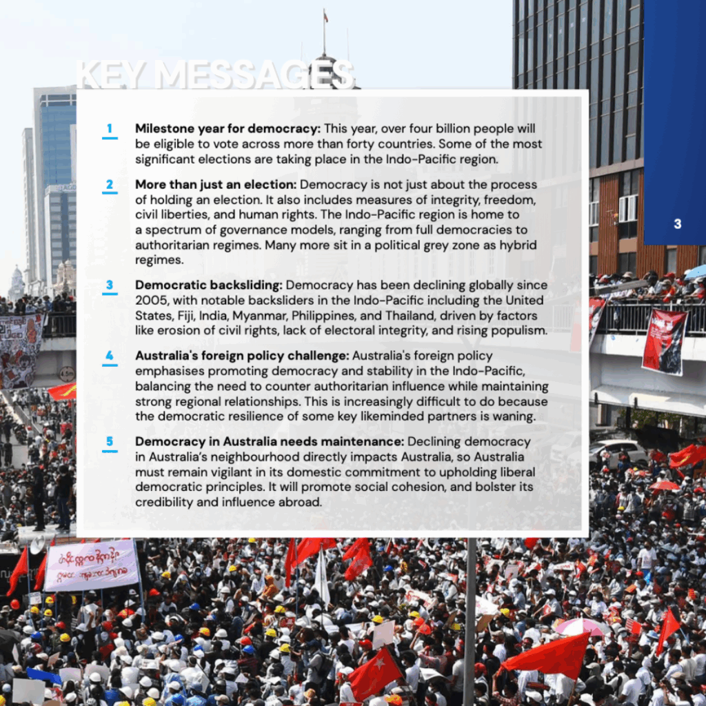 Essential reading for policymakers, scholars, the business community, and anyone invested in the future of democracy in the region. This analysis underscores the importance of democratic governance for security, trade, and Australia’s strategic interests in the Indo-Pacific.